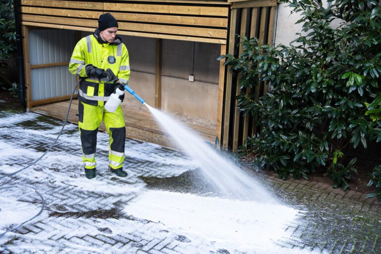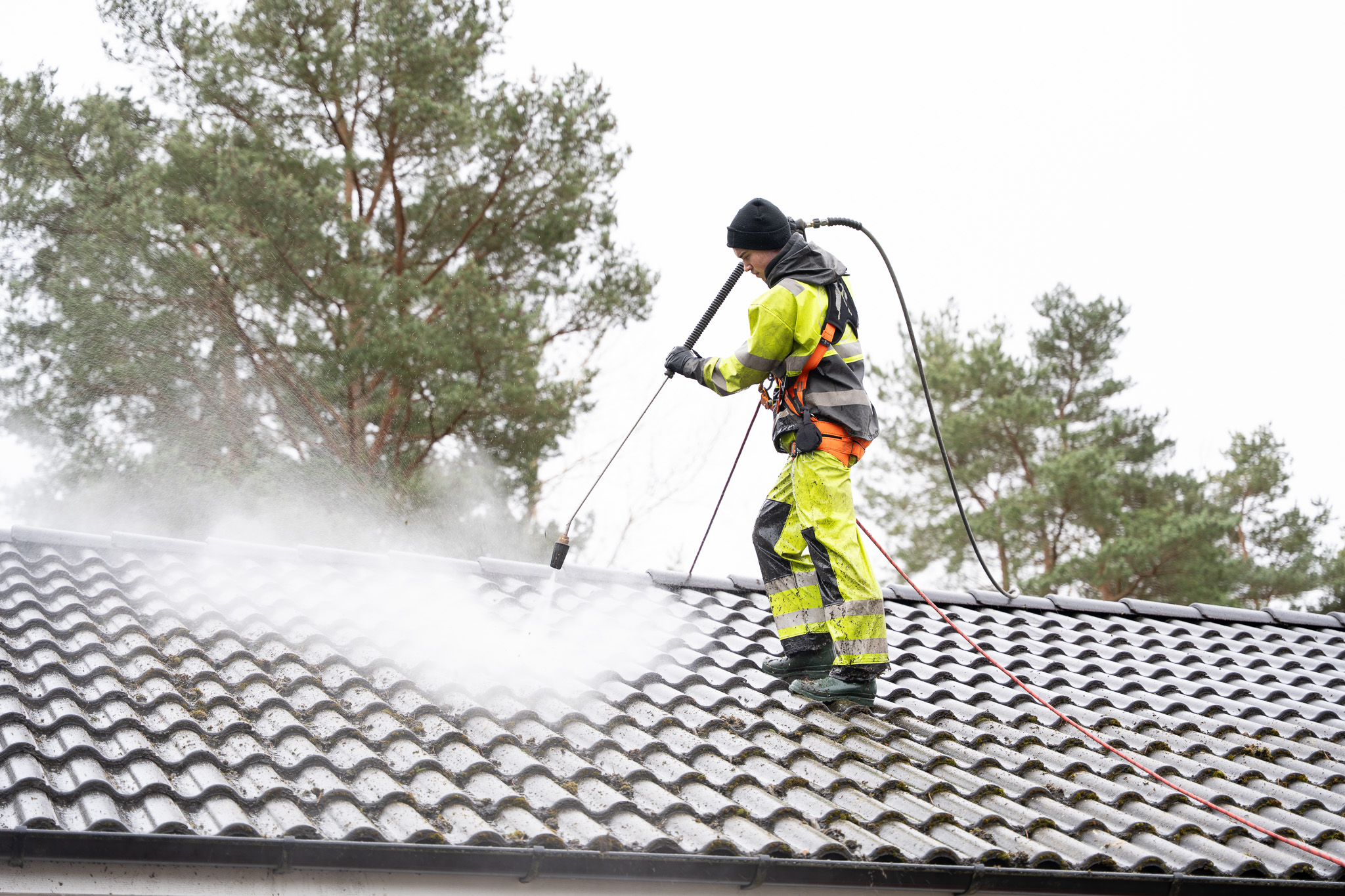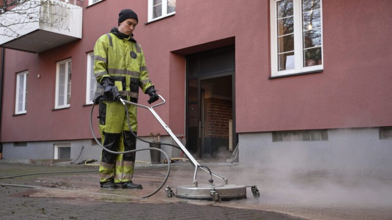 Med specialanpassad högtryckstvätt rengör vi effektivt utan att skada ytan.