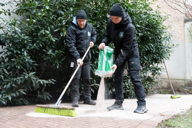 Vi avslutar med att fylla på mellan plattorna med ny fogsand i passande kulör till era stenplattor.